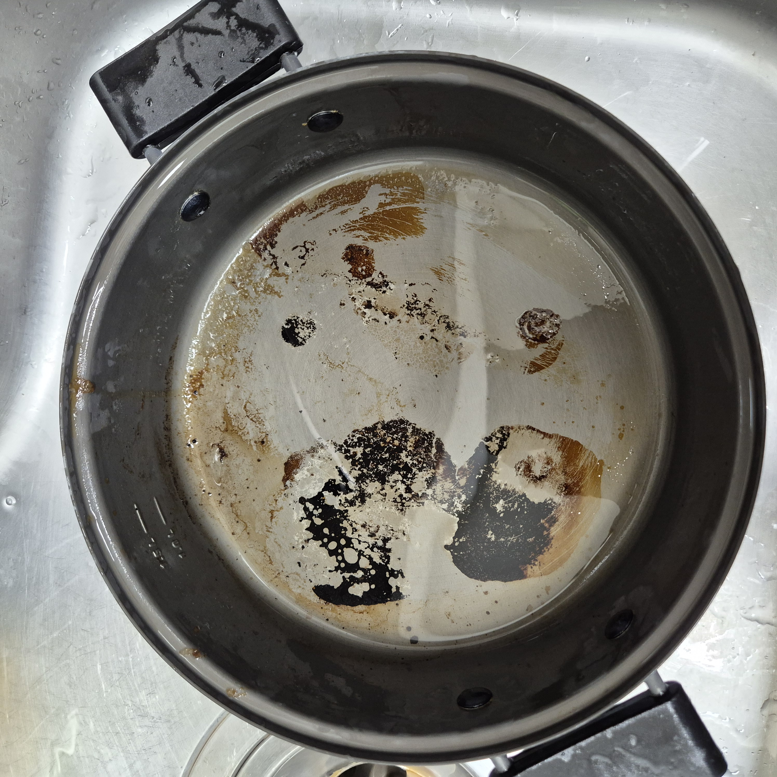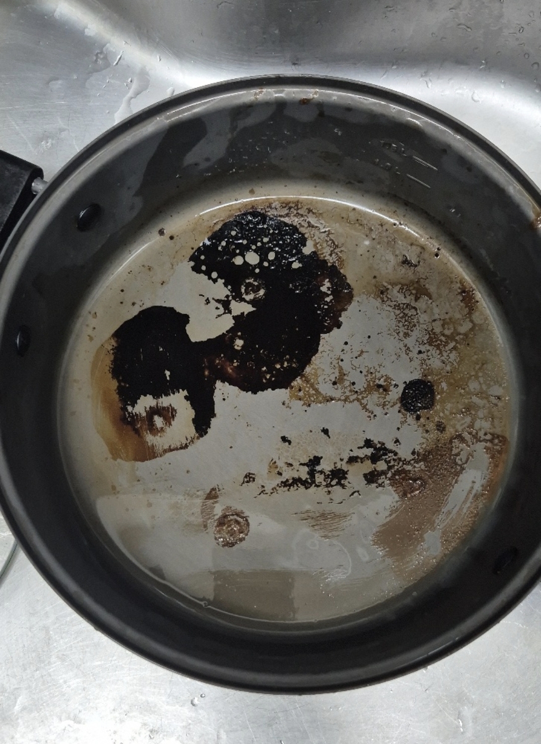 식힌 후 가볍게 솔질 한 것이다.(철수세미로 문지를 수 있겠지만 그러면 냄비 코팅이 다 벗겨져 탄걸 제거하는 것보다 더 손해다)